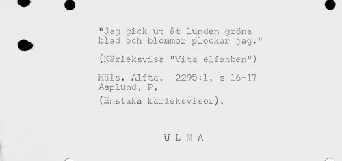//// "Jaa cdck ut åt lunden gröna //// ^^ blad och blommor plockar jag." //// (Kärleksvisa "Vita elfenben") //// Häls. Alfta, 2295:1, s 16-17 //// Asplund, P, //// (Enstaka kärleksvisor). //// U L M A ////