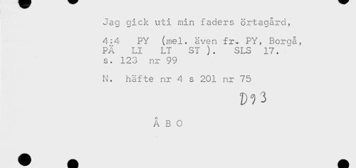 //// Jag gick uti min faders örtagård, //// 4:4 PY (mel. även fr^- PY, Boraå, //// PÄ LI LT ST ). SLS 17. //// s. 123 nr 99 //// N. häfte nr 4 s 201 nr 75 //// D?3 //// ÅBO ////