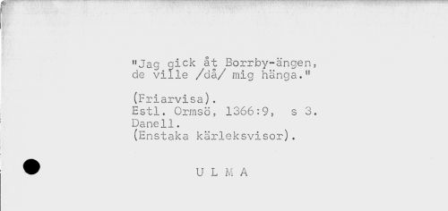 //// "Jag gick åt Borrby-ängen, //// de ville /då/ mig hänga." //// (Friarvisa). //// j Estl. Ormsö, 1366:9, s 3. //// Daneli. //// (Enstaka kärleksvisor). ////