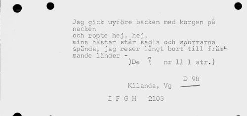 //// Jag gick uyföre backen med korgen på //// nacken //// och ropte hej, hej, //// : mina hästar står sadla och sporrarna //// spända, jag reser långt bort till främ^ //// mande länder - //// )De nr 11 1 str.) //// D 98 //// Kilanda, Vg--- //// I F C H 2103 ////
