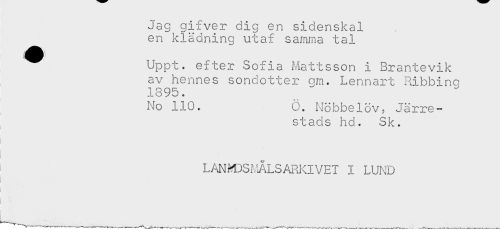 //// Jag gifver dig en sidenskal //// en klädning utaf samma tal //// ^ Uppt. efter Sofia Mattsson i Brantevik //// av hennes sondotter gm. Lennart Ribbinq //// 1895. //// No 110. Ö, Nöbbelöv; Järre- //// stads hd. Sk. //// LANMDSMALSARKIVET I LUND //// ) ////