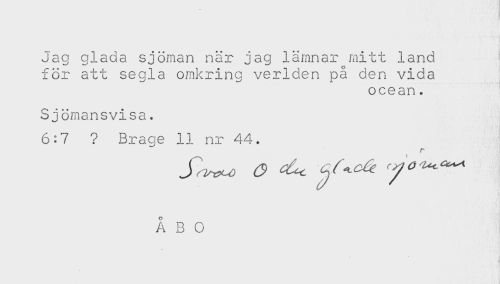 //// Jag glada sjöman när jag lämnar mitt land //// för att segla omkring verlden på den vida //// ocean. //// Sjömansvisa. //// 6:7 ? Brage 11 nr 44. //// r ////