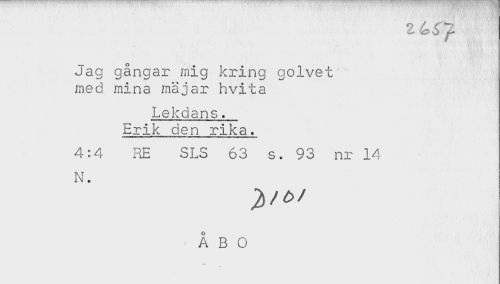 //// Jag gångar mig kring golvet //// med mina mäjar hvita //// Lekdans. //// Erik den rika. //// 4:4 RE SLS 63 s. 93 nr 14 //// N. ////