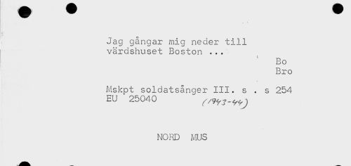//// i //// Jag gångar mig neder till //// värdshuset Boston ... //// ' Bo //// Bro //// Mskpt soldatsånger III. s . s 254 //// EU 25040 //// NORD ms ////