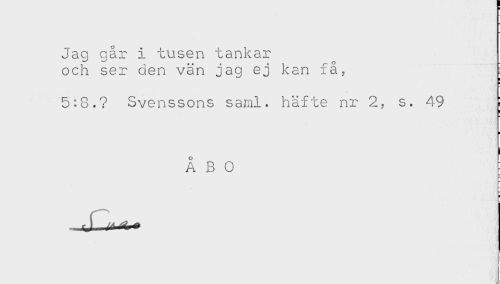 //// Jag går i tusen tankar //// och ser den vän jag ej kan få, //// * . **. //// 5:8.? Svenssons saml. häfte nr 2, s. 49 //// ÅBO ; //// /jjijf ////