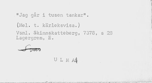 //// ! //// i //// "Jag går i tusen tankar". i //// i //// (Mel. t. kärleksvisa.) //// ti //// Vsml. Skinnskatteberg, 7378, s 28 //// Lagergren, E. //// )) //// U L M A^ ////