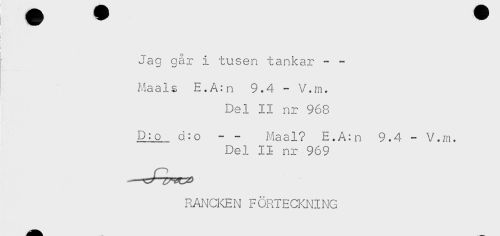 //// i //// ! //// Jag går i tusen tankar - - //// Maals E.A:n 9.4 - V.m. //// Del II nr 968 //// D:o a:o - - i^aal? E.A:n 9.4 - V.m. //// Del II nr 969 //// RANCKEN FÖRTECKNING ////