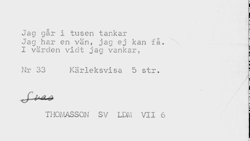 //// Jag går i tusen tankar //// Jag har en vän? jag ej kan få. //// I värden vidt jag vankar. //// Nr 33 Kärleksvisa 5 str. //// -- //// / //// ! //// THONiASSON SV LDM VII 6 //// - ////