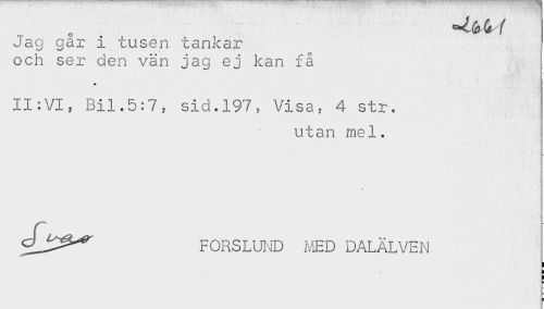 //// Jag gar i tusen tankar //// och ser den vän jag ej kan få //// II:VI, Bil.5:7, sid.197, Visa, 4 str. //// utan mel. //// FORS LUND MED DALÄLVEN ////