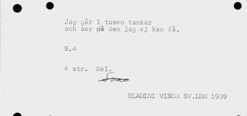 //// ! //// i //// ! Jag går i tusen tankar //// I och ser på den jag ej kan få, //// ! //// S.4 //// 4 str. Mel. //// BLADINI VISOR SV.LDM 1939 ////