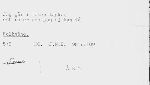 //// Jag går i tusen tankar //// och söker den jag ej kan få, //// i //// Folksåno. //// 5:8 HO. J.N.E. 98 s.109 * //// ) //// < ////