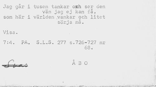 //// Jag gar i tusen tankar ogh ser den //// vän. jag ej kan få, //// som här i världen vankar och litet //// sörja må. //// Visa. //// 7:4. PA. S.L.S. 277 s.726-727 nr //// 68. //// * ////