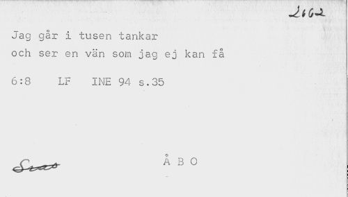 //// Jag går i tusen tankar //// och ser en vän som jag ej kan få //// 6:8 LF INE 94 s.35 //// r ÅBO ////