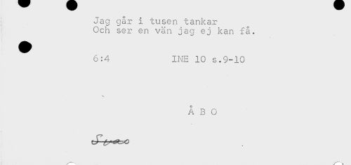 //// Jag går i tusen tankar //// Och ser en vän jag ej kan få. //// 6:4 INE 10 5.9-10 //// ÅBO ////