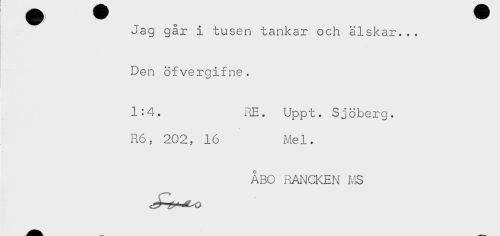 //// Hy ^^ ^^^ //// Jag går i tusen tankar och älskar... //// - //// Den ofvergifne. //// 1:4. RE. Uppt. Sjöberg. //// R6, 202, 16 Mel. //// ÅBO RANCKEN MS ////