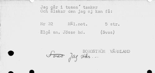 //// Jag går i tusen/ tanker //// Och älskar den jag ej kan få: //// ) Nr 32 MEl.not. 5 str. //// Elgå sn. Jösse hd. (Svas) //// i * //// A /n__BOiiGSIRÖM VÄRMLAND ////