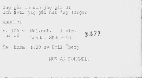 //// Jag går in och jag går ut //// och &var jag gar har jag sorgen //// Danslek //// s . 106 v Mel. not. 1 str. ^ ^ ^ 9 //// nr 13 , , . //// Lunda ? Soaermla //// t- //// Se komm. s<88 av Emil Oberg //// MUS AK FOLKNEL. //// j ////