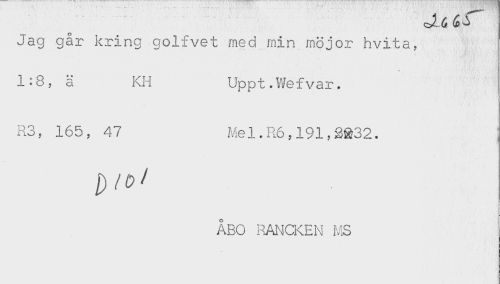 //// ....... //// Jag går kring golfvet med min möjor hvita, //// * //// 1=8, ä KH Uppt.Wefvar. //// R3, 165, 47 Mel.R6,191,8832. //// ÅBO RANCKEN MS ////