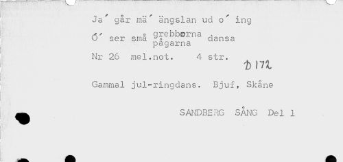 //// Ja' går mä' ängslan ud o' ing //// ^ ^ ^ o grebbs-rna ^ //// u ser sma dansa //// pagarna //// Nr 26 mel.not. 4 str. //// t !7t //// Gammal jul-ringdans. Bjuf, Skåne //// { ^ SANDBERG SÅNG Del 1 ////