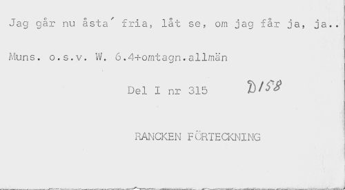 //// Jag går nu åsta' fria, låt se, om jag får ja, ja.. //// Muns. o.s.v. W. 6.4+omtagn.allmän //// Del I nr 315 //// RANCKEN FÖRTECKNING //// -M ////