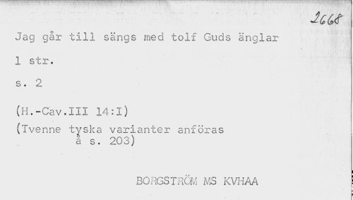 //// Jag går till sängs med tolf Guds änglar //// 1 str. //// s. 2 //// (H.-Gav.III 14:1) //// (ivenne tyska varianter anföras //// a s. 203) //// BORGSTRÖM MS KVHAA ! ////