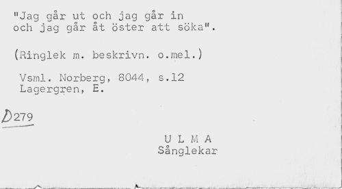 //// "Jag går ut och jag går in //// och jag går åt öster att söka". //// (Ringlek m. beskrivn. o.mel.) //// Vsrnl. Norberg, 8044, s.12 //// Lagergren, E. //// /)279 //// U L M A //// Sånglekar ////