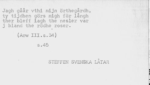 //// Jagh gåår vthi mijn örthegårdh, //// ty tijdhen görs migh för långh //// ther bleff iagh the nesler var //// j bland the rödhe roser. //// w //// (Arw III.s.34) //// s.45 //// STEFFEN SVENSKA LATAR ////