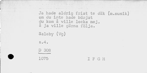 //// /! - - - " - —^ ^ - . ---- ' _ . _ / //// - — - //// Ja hade aldrig friat te däk (m.musik) //// om du inte hade börjat //// du kom å ville locka mej, //// a ja ville gärna följa. //// Saleby (Vg) //// s .4. //// D 308 //// ^ 1075 I F G H ////