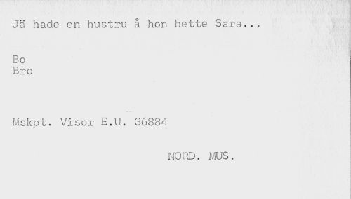 //// Jä hade en hustru å hon hette Sara... //// Bo //// Bro //// * //// Mskpt. Visor E.U. 36884 //// NORD. MUS. ////