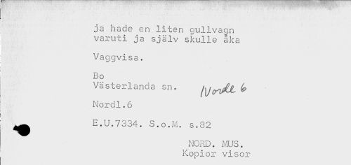 //// * * ^ * ' ' '- WWiMHM^WnHyV^ wV "i-! //// ja hade en liten gullvagn //// varuti ja själv skulle åka //// Vaggvisa. //// ! Bo //// i //// Västerlanda sn. //// Nordl.6 //// i //// ^ E.U.7334. S.o.M. s.82 //// NOFU). MUS. //// Kopior visor ////