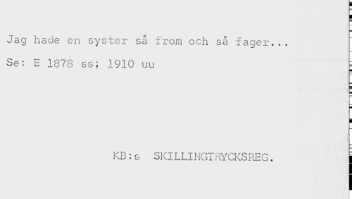 //// Jag hade en syster så from och så fager... //// Se: E 1878 ss; 1910 uu = //// i— //// ) //// ' //// KB:s SKILLINGTRYCKSREG. j ////