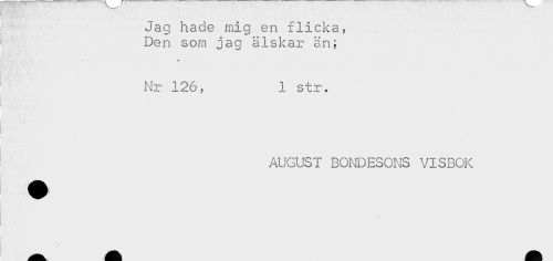 //// Jag hade mig en flicka, //// Den som jag älskar än; //// - //// Nr 126, 1 str. //// i //// AUGUST BONDESONS VISBOK ////
