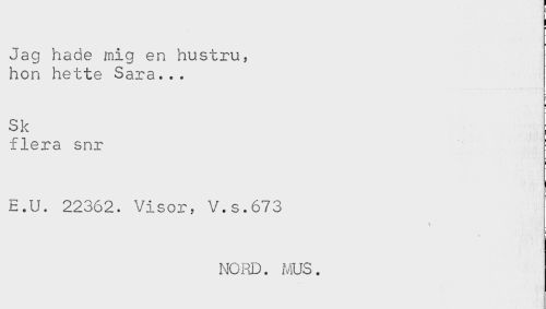 //// Jag hade mig en hustru, //// hon hette Sara... //// Sk //// flera snr //// E.U. 22362. Visor, V.s.673 //// \ //// NORD. MUS. ////