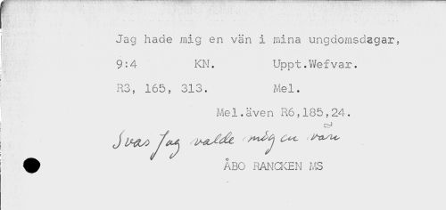 //// Jag hade mig en vän i mina ungdomsdagar, //// -t //// i //// 9:4 KN. Uppt.Y^efvar. //// J //// R3, 165, 313. Mel. //// Mel.även R6,185,24. //// ^ ÅBO PANQ<EN f.^S ////