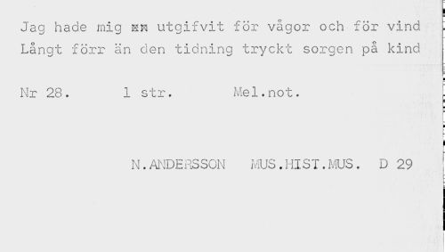 //// Jag hade mig ssn utgifvit för vågor och för vind //// Långt förr än den tidning tryckt sorgen på kind //// i //// Nr 28. 1 str. Mel.not. //// s //// t- //// H //// N./WDEaSSON MUS. Hl SI. N!US. D 29 ': //// < //// — //// { ////