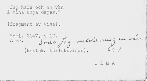 //// "Jaq hade och en vän i //// i mina unga dagar." ^ //// i //// < //// (fragment av visa). //// ) //// Sdml. 3147, s.13. . ^ ^ j //// Arne. ' ^ ^ — //// (Enstaka kärleksvisor). ^ I //// < //// < //// ! //// t //// { //// U L M A //// . //// ^ . . _ _ V,.V ////