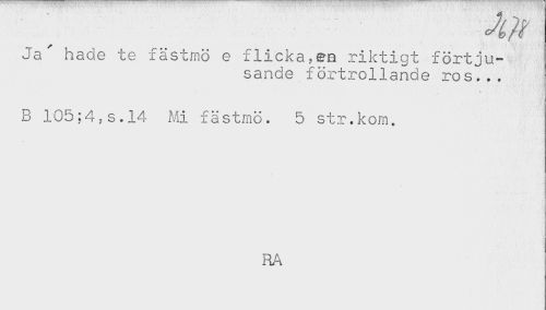 //// Ja" hade te fästmö e flicka,en riktigt förtju- //// sande förtrollande ros".. //// B 105:4,s.14 Mi fästmö. 5 str.kom. //// RA ////