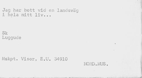 //// Jag har bott vid en landsväg //// i hela mitt liv... //// Sk //// Luggude //// % //// Mskpt. Visor, E.U. 34910 //// NORD.MUS. ////