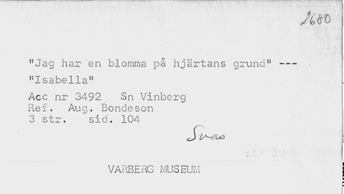 //// "Jag har en blomma på hjärtans grund" --- //// "Isabella" //// Acc nr 3492 Sn Vinberg //// Ref. Aug. Bondeson //// 3 str. sid. 104 //// J . ' - . . ' . - -L //// VAFBERG MUSEUM j //// ! //// H ////