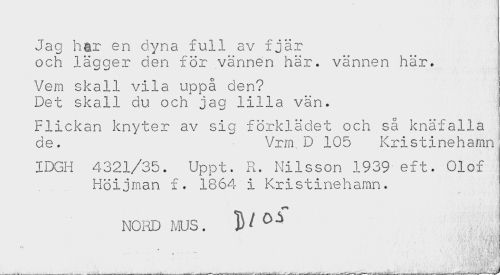 //// Jag h§.r en dyna full av f jar //// och lägger den för vännen här. vännen här. //// Vem skall vila uppå den? //// Det skall du och jag lilla vän. //// Flickan knyter av sig förklädet och så knäfalla //// de. Vrm,D 105 Kristinehamn //// IDGH 4321/35. Uppt. R. Nilsson 1939 eft. Olof //// Höijman f. 1864 i Kristinehamn. //// NOI^DMUS. //// -'i t '. ; //// * - \ . . ' //// - - , ..... - * ' - - V ' ^ *;.:'< //// . , - , . .. . . //// "t*. * '' . .''-?-'*''<'t i--' //// .___^ , —., - -, i- -1 „ i , ^ , i,,, *'- ////