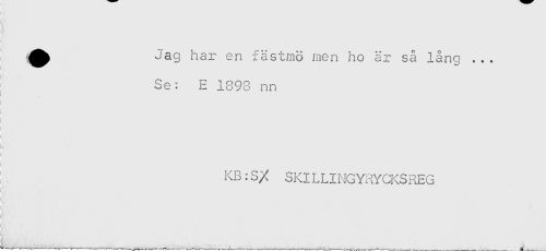 //// ! ' //// ! //// Jag har en fästmö men ho är så lång . . . //// ! //// Se: E 1898 nn //// ! //// ! //// i //// t //// !. //// ! KB:S/ SKILLINGYRYCKSREG //// ————^ — ---- —— ------- //// ! ' . //// ! //// ^ ' ^ )) )! H) !)!)!))) H !H!)H)))) //// ^ 'n! H H n //// 'i- //// ---—--......--—,-..............^^^.....______ __ ___ ////