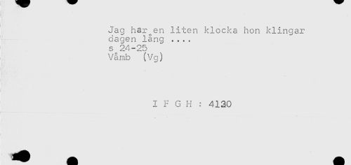 //// Jag harmen liten klocka hon klingar //// dagen lång .... //// s 24-25 //// Våmb (Vg) //// I F G H : 4130 //// I ' ""*** .........* .....*—' ---- //// — — — .... ? ////