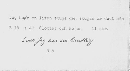 //// ! //// ! //// i //// t //// Jag ha/r en liten stuga den stugan är dock min //// B 15 s 43 Slottet och kojan 11 str. //// i //// i //// R A //// i //// ! ////
