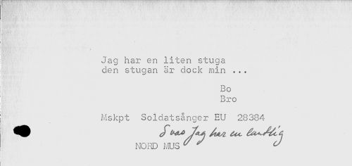 //// - Jag har en liten stuga //// h den stugan är dock min ... //// Bo //// Bro //// i' //// Mskpt Soldatsånger EU 28384 //// NORD MUS ^ ^ ^ ////