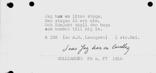//// Jag haD en liten stuga, //// Den stugan äå ock min. //// Och ödmjukt skall den buga //// eom kommer till mig in. //// S 158 (av A.M.,Lenngren) 1 str.Mel. //// COLLIATJDER FM o. FT 1916 ////