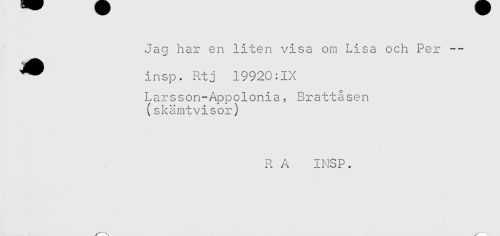 //// Jag har en liten visa om Lisa och Per -- //// ^ insp. Rtj 19920:IX //// Larsson-Appolonia, Brattåsen //// (skämtvisor) //// R A INSP. ////