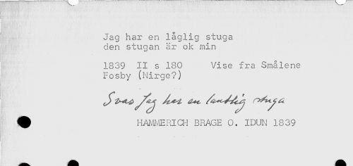 //// Jag har en laglig stuga //// den stugan a.r ok min //// 1839 II s 180 Vise fra Smålene //// Fosby (Nirge?) //// ^ HAIvMEI-ilCH BPAGE 0. IDUN 1839 //// < * < ////