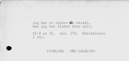 //// f //// Jag har en vackerwn utvalt? //// Den jag har älskat över allt? //// 11:9 nr 31? sid. 172? Kärleksvisa //// 1 str. //// i ' <. . ' //// ^ FOFSLUTJD N!ED DALÄLVEN //// - . -t . ^ . .. ////