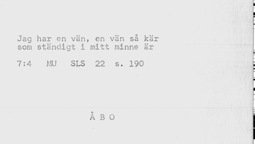 //// Jag har en vän, en vän så kär //// som ständigt i mitt minne är //// 7:4 MU SLS 22 s. 190 t //// H //// ! //// ÅBO j ////