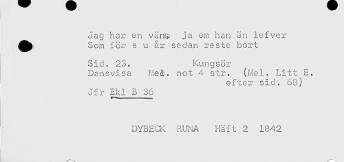 //// Jag har en vänr^ ja om han än lefver //// Som för s u år sedan reste bort //// Sid. 23. Kungsör //// Dansvisa Me &. not 4 str. (Mel. Litt E. //// efter sid. 68) //// Jfr Ekl B 36 //// DYBECK RUNA Häft 2 1842 ////